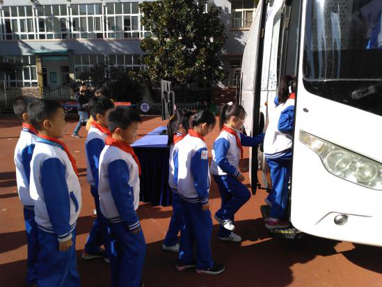 (同学们排队参观安全电梯流动大巴车)